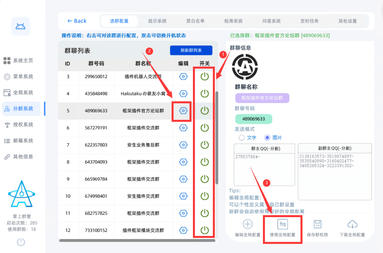 【目前无法一键让全部群使用自己编辑的全局配置,只能一个一个点设置然后使用全局配置】