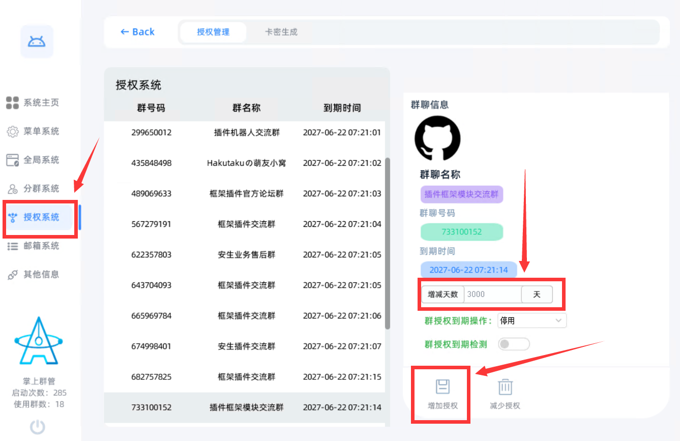 7.接下来点击授权系统,点击群聊,授权天数填上,点击增加授权