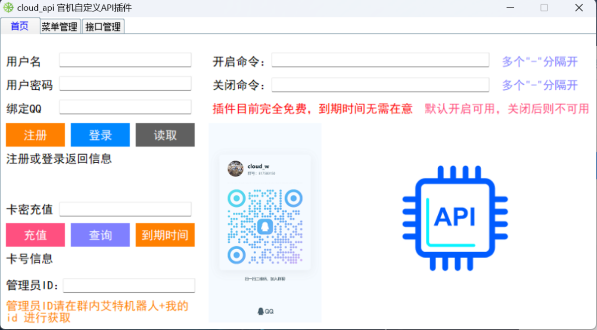 使用教程-通过cloud_update.exe下载到插件后,需要重命名插件为cloud_api.dll。该插件的名称为:cloud_api.dll,目前插件兼容bee官方机器人框架,无后缀名,直接以.dll结尾。插件安装-下载插件后,将插件放入机器人框架的plugin目录下。启动机器人,插件即可自动加载。启用插件后,打开插件设置页面,填入自己的QQID。[QQID获取方式:艾特机器人+我的id,即可获取到自己的QQID]第一次使用插件时,进入菜单进行恢复菜单上述操作完成后,需要设置开启命令和关闭命令,方便某些特定群的开启或关闭。完成后,即可进行添加自定义API关于授权-目前插件完全免费,无任何收费功能。插件文档-您好,本帖含有特定内容,请回复后再查看。